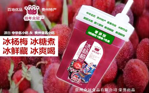 “冰楊梅”是一種冰飲的楊梅汁。它最早起源于貴州苗族村寨,是貴州地區常見的一種家庭和街邊民間特色小吃型飲品。傳統冰楊梅的做法是取鮮楊梅加白砂糖和水一起煮,煮好之后倒進壇子里,再把壇子放進冰涼的水中降溫之后飲用。由于傳統制作和儲存條件的局限,傳統冰楊梅不易儲存保鮮;但這并不影響人們對它的喜愛。